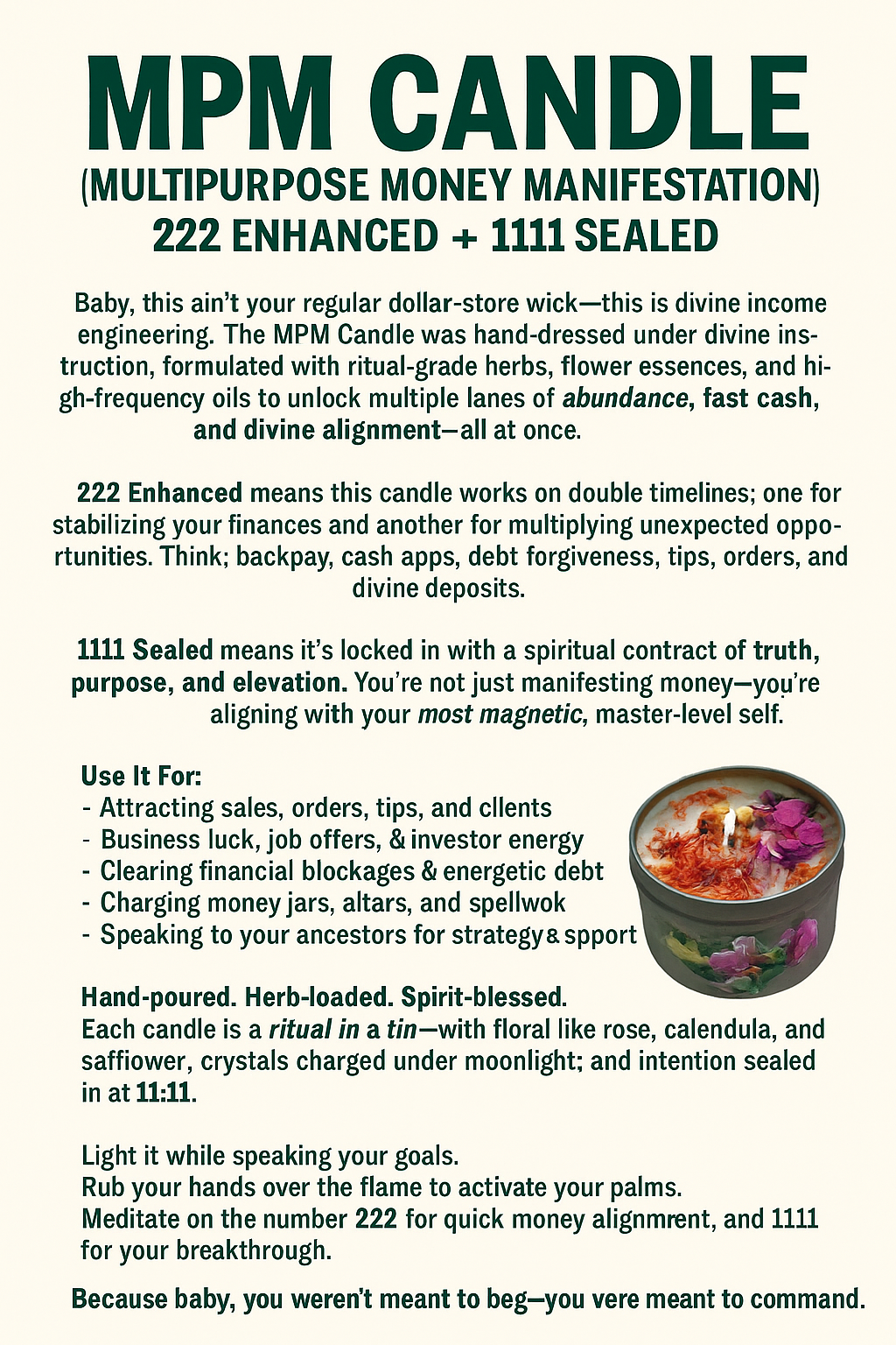 Baby, this ain’t your regular dollar store wick this is divine income engineering. The MPM Candle was hand-dressed under divine instruction, formulated with ritual-grade herbs, flower essences, and high-frequency oils to unlock multiple lanes of abundance, fast cash, and divine alignment all at once.